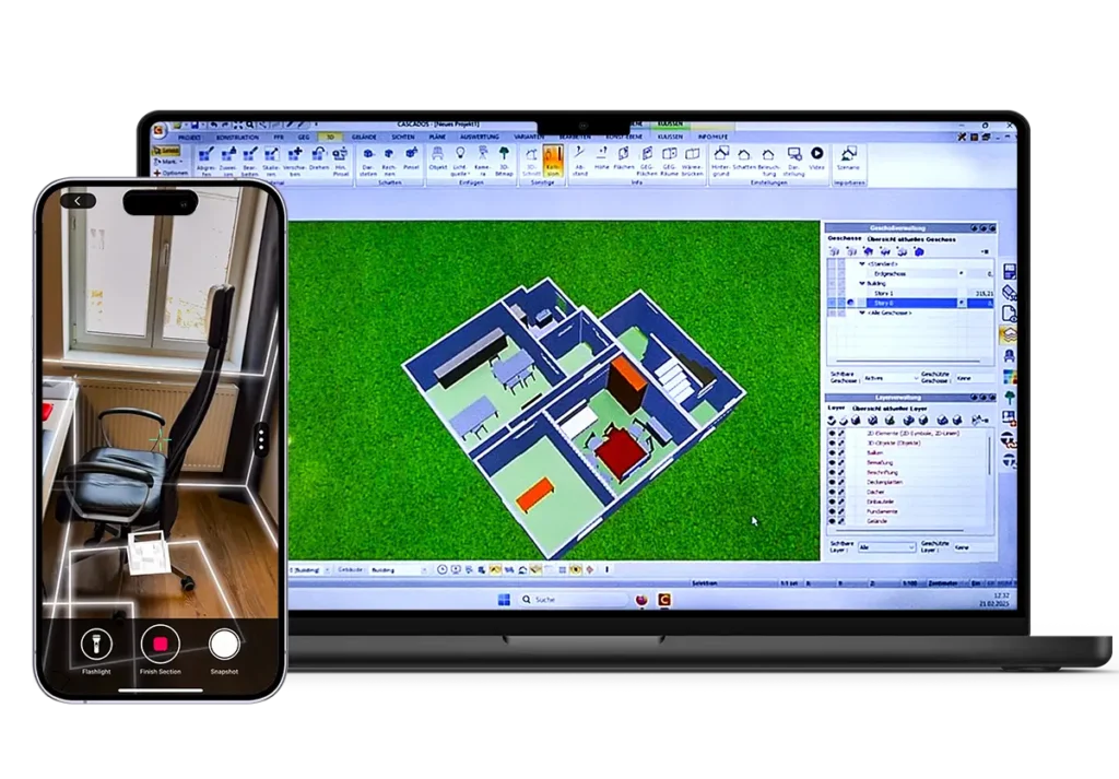 Scanne Räume oder ganze Gebäude mit dem iPhone Pro oder iPad Pro und erhalte präzise 3D-Raummodelle für CASCADOS / Ecad .